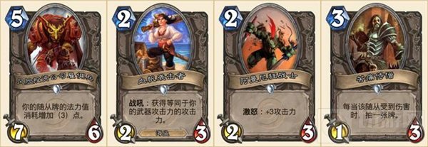 阿曼尼狂战士:对任何能有1点伤害触发激怒的卡组,阿曼尼狂战士都是非常好用的。法师的烈焰冲击,战士的严酷的监工就是非常好的例子。在一局内,它就能成长为5/2甚至7/2。可以用来给对手补刀或者交换高费随从。
