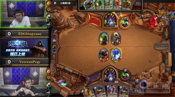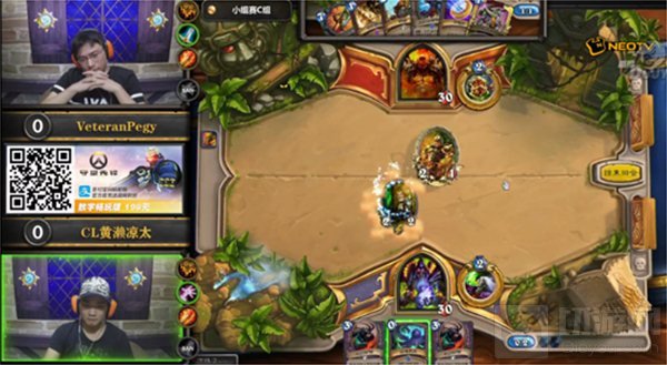 第二盘小易依旧使用动物园术士,冰炫则使用了萨满,6费回合术士虚空行者加末日守卫下场,萨满基本无力翻盘,1:1,小易将比分扳平;
