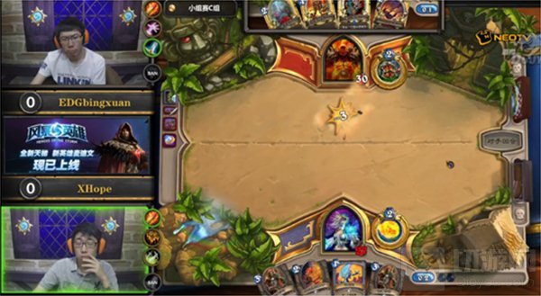 首盘冰炫的龙战士起手十分顺利,开场便有精灵龙加暴乱狂战士站场输出,而XHope则使用了近来比较冷门的冰法,冰法面对起手这么顺的龙战士也显得毫无办法很快败下阵来,1:0,冰炫取得开门红;