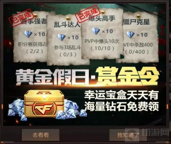 黄金假日悬赏令 任务,打开游戏即可参与领钻,或者打开任务 也能参与,这么多钻石不拿白不拿哦!