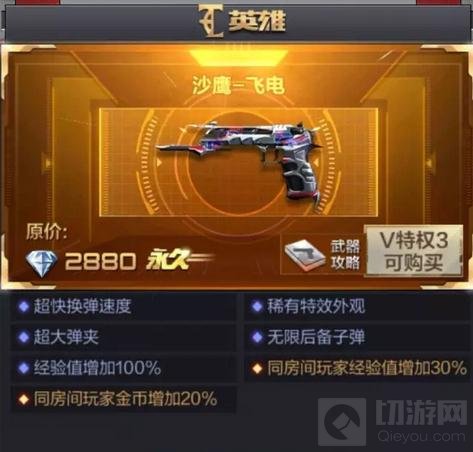 优点:沙鹰-飞电拥有炒鸡酷炫的外观,极具现代感,相信很多战友第一眼就被他样貌俘虏。作为第一把英雄级武器的手枪,它换弹速度快,武器子弹弹夹大,后备子弹无限,妈妈再也不用担心我的子弹会用完了,追着敌人打都不怕 ,没错就是任性!绝对是持久战的必备品,轻松应对一切挑战!