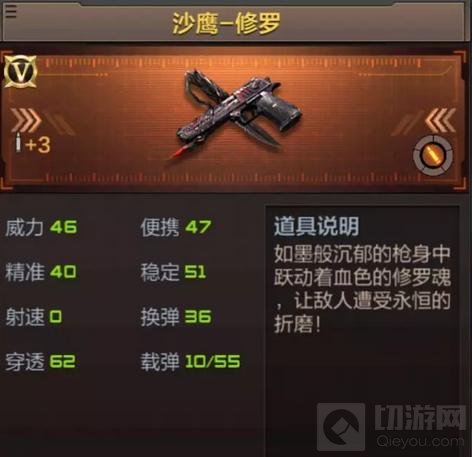 优点:沙鹰-修罗弹道精准,威力巨大,堪称杀人越货,必备良品,小编给它五星级好评。而且它还拥有特有的近战攻击,大大提高了它的战场存活率,试想一下,要是敌人走太近,不想浪费子弹的话,为什么不咔嚓他一下呢?小编建议,拥有此枪的战友最好配合狙击枪或者大炮,更能发挥最大作用!