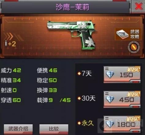 优点:沙鹰-茉莉作为茉莉系列的武器,属性相当不错~威力和射击精准度都有所提高,不用担心要几枪才能杀死对方,一枪爆头才是真理!战友在使用的同时,还可以感受到茉莉涂装的中国风,这不经让小编想起同样是中国风的兰,两者一起登场,哇塞!一定能HOLD住全场的!