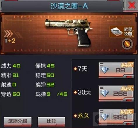优点:沙漠之鹰-A是在沙漠之鹰的基础上强势升级的!它不但提升子弹夹子弹数,还提升换弹速度和稳定性!任何一把枪,多一发子弹,快一秒速度,都随时可能逆转战局! 何况它还全身披着迷彩涂装,显露自己霸气的枪身,仿佛告诉全世界其不可动摇的地位,绝对是喜欢这类风格的战友的最佳选择!