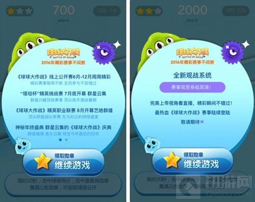 2016年《球球大作战》各项赛事精彩不间断,线上公开赛将从6月一直持续到12月,每周都将有精彩的比赛送上。游戏的第一个官方正式的线下赛事——“塔坦杯”精英挑战赛也将在今年的ChinaJoy(7.28~7.31)上正式开幕。到了8月份,《球球大作战》精英职业联赛也将拉开帷幕,这标志这球球的职业化又迈上了一个新的台阶。最后则是《球球大作战》年终盛典,这将是所有球宝们的聚会。