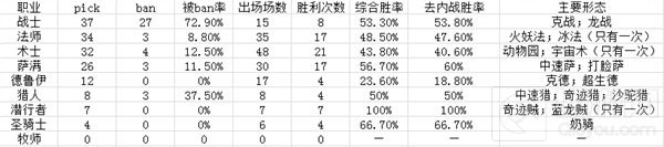 从ban选的情况来看,当前版本下,战士肯定是最强势的职业,但是由于大多时候是被ban掉的,因此,具体胜率其实不得而知。但是单单从本次比赛的胜率和出场率来说,动物园在本版本中也相当强势。