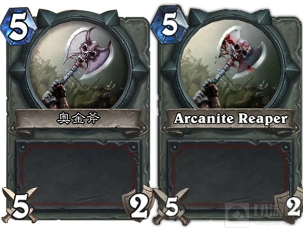 基础卡:奥金斧上的血迹,以及骷颅头上长角。这个是为了显得不血腥,然后凸显奥金斧的骷髅是某种长角的生物?