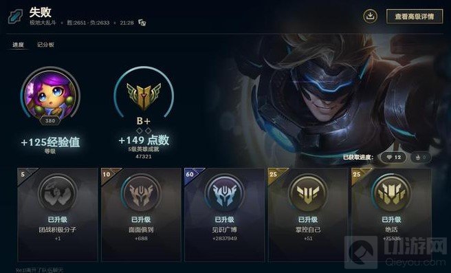 新增成就系统以后,结束游戏后给队友点完赞就会来到成就页面而不是计分板。里面会详细告诉你这局游戏你成功解锁了哪些成就,或者成就的进度条增加了多少。而且这个成就系统是不计算历史游戏数据,比如“团战积极分子”是指参团率大于90%,我打完一局游戏这个成就的进度条只加一了,关于对局内游戏行为的成就都是从零开始的。但是对于皮肤、英雄、头像表情这些带有收集性质的召唤师成就是继承历史数据的。