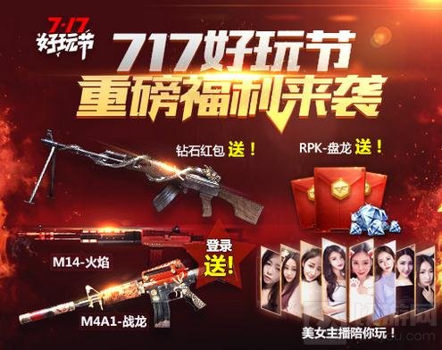 随着新地图“酒店危机”的推出和大头、手雷大乱斗模式的限时开启,CF手游还将一同推出“717”好玩节劲爆活动。本次活动福利极度丰厚,7重福利免费送给玩家:英雄武器赠你玩、神秘红包送你玩、只要一钻任你玩、满屏金卡等你玩、全新乱斗随你玩、诚意回馈带你玩、美女主播陪你玩。RPK-盘龙,AWM-茉莉,MG3-迷彩,灵狐者,金卡,海量钻石和道具都将免费送给玩家,更有人气美女主播陪伴玩家一同枪战。