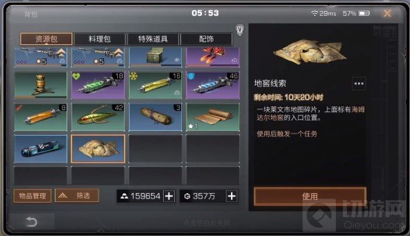 我们走到帐篷的顶上进行搜索,就可以在一顶帐篷的上面看到信封的线索,拾取然后打开信封就可以在地图上看到地窖入口的位置了。