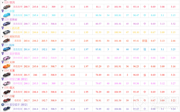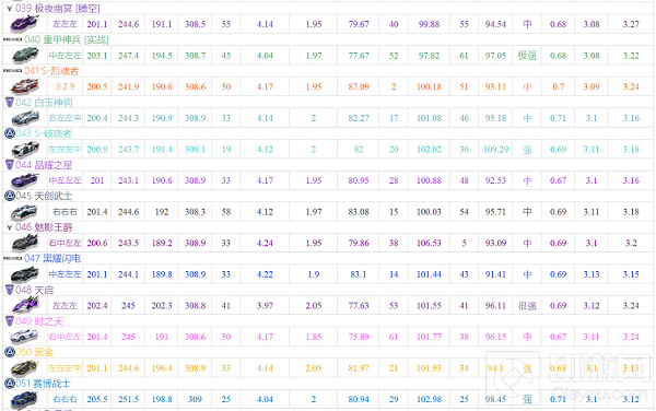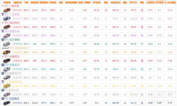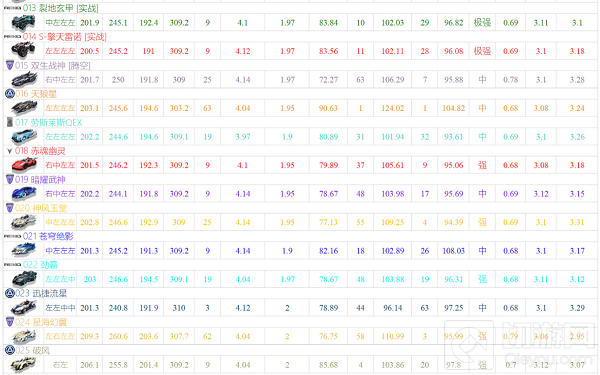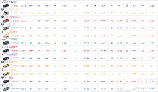 上图的排行榜就是目前63款A车里面最新的排行了,玩家可以参考一下。排名是按照平跑、断位双喷、转向速度、Cww喷、排名、原地转向用时、漂移一周用时、氦气动力、小喷净动力、焦气等方面来进行测试的,可以说是比较全面了。