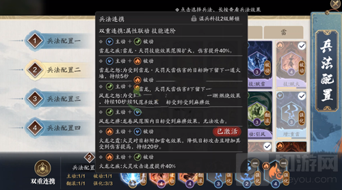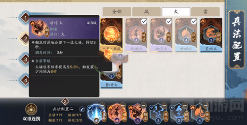 2.雷和火相对输出能力更高一些,不管是被动,翻滚,还是强化都优先选择增加输出的兵法,类似风的加盾技能,和雷的回血技能可以先不升级。