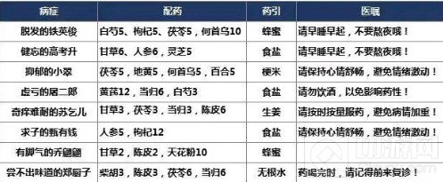 药材:白芍5,茯苓5,枸杞5,何首乌10,药引:蜂蜜,医嘱:请早起早睡,不要熬夜哦!