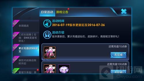 【活动介绍】版本更新后,累计充值送钻石,皮肤碎片,高级铭文等好礼!