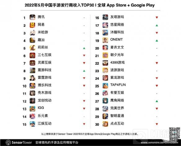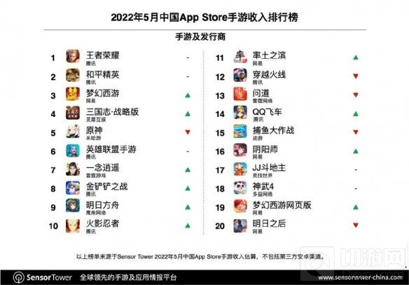 2022年5月中国App Store手游收入排行榜前两名继续由腾讯《王者荣耀》与《和平精英》获得。随着《明日方舟》3周年庆典活动的开始,鹰角网络收入在5月迎来一波强势增长,环比激增313%。