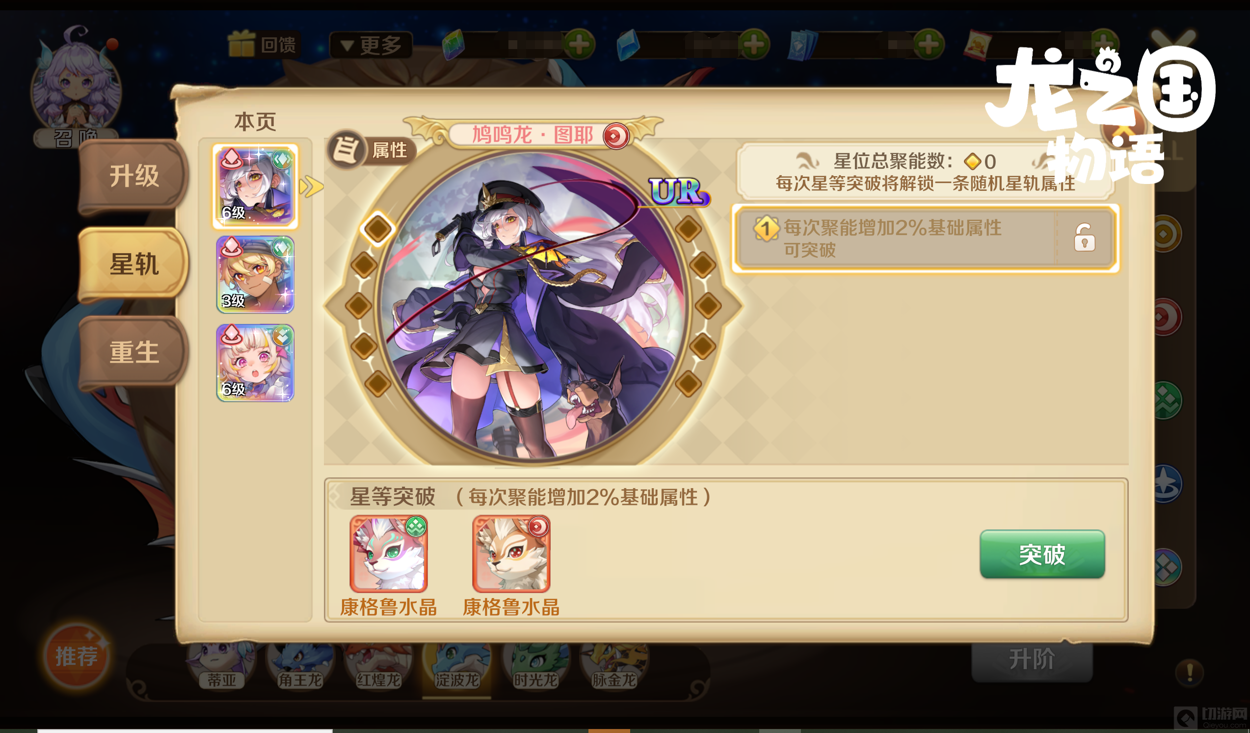 星轨是培养UR龙晶的重点之一。消耗2个SSR龙晶成功进行星等突破后,将解锁星轨属性和新星位。星位可以使用龙之结晶进行聚能,首次突破后每次聚能增加2%基础属性。