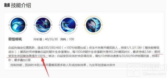4.如果我问你白起的大招是什么相信绝大多数玩家都会说是嘲讽敌人,造成伤害这个直接略过就可以了,但是不知道多少人知道嘲讽敌人期间白起收到的生命回复效果是翻倍的呢?也就是说假如白起嘲讽了敌人,这时候白起再用一技能就可以回复4%的已损生命值,并且这时候白起使用治疗造成的效果也是双倍的哦,时刻记住这点在团战或者逃命时都有很大的作用哦!