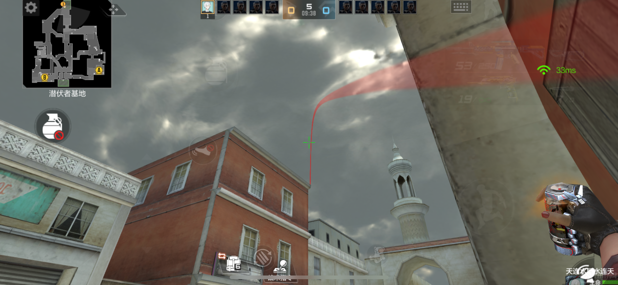 然后,以下方的图片作参考,抛物线的尾端对准下方砖红色建筑物的尖角就可以了。如果一定要找到准星该放在什么位置的话,在垂直方向上可以参考下方的砖红色建筑物,在水平方向上可以用右侧白色的塔作为参照物。