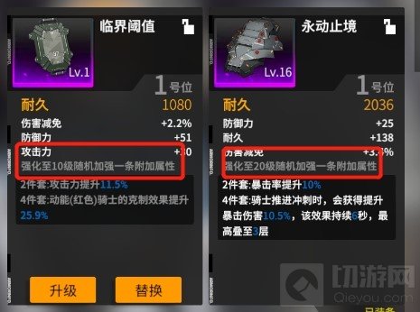 其二:装甲每强化每10级,就会随机附加一条属性,这个时候就非常考验运气的时候咯,可以大呼“锦鲤附体”哈哈!要是暴击、爆伤、攻击就很开心。要是附加伤害减免,耐久这些也不要灰心,因为附加属性还是要看怎么搭配骑士了。另外完全不要担心“如果以后刷到更好的装甲”该怎么办,只需要把已经升级的装甲吞掉就好啦,经验可以转移很多很多很多,只会损失一点点。