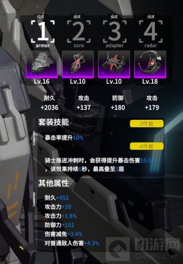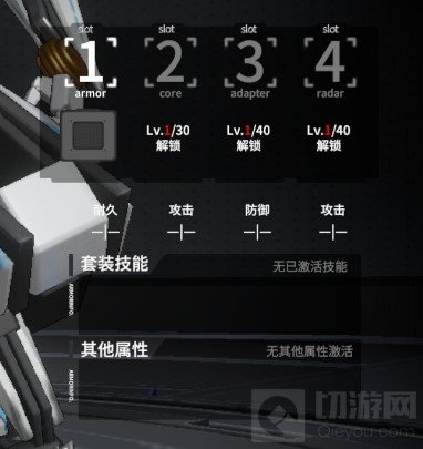 游戏中装甲共有4个装备槽,分别是1号位armor-防护装甲板、2号位core-量子核心、3号位adapter-增幅器、4号位radar-火控雷达。解锁条件只需要骑士达到相应的等级即可开启,1号位直接开启,2号位30级开启,3号位40级开启,4号位40级开启。