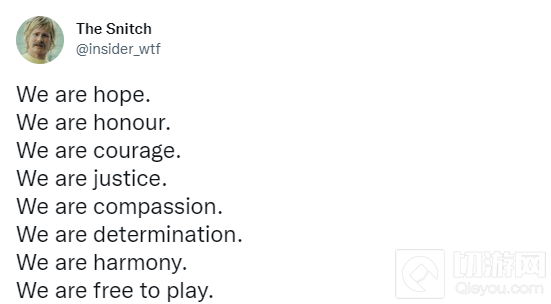 新晋舅舅党The Snitch今日再发猛料,不过这次爆料的方式有点“特别”。The Snitch在推特上发布了一长串类似于“宣言”的爆料,而其中写到的内容与《守望先锋》官方在2015年发布的剧场版宣传视频中的文案内容“完全一致”,只是削微有些不同之出。