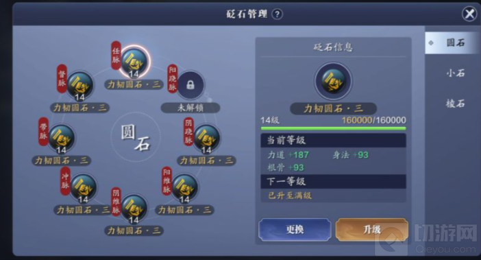 在论剑及其他PVE玩法方向的砭石选择上,主要考虑力道、攻击、会心属性。具体来说,从龙在圆石选择上,以力韧圆石为佳,如果是月卡玩家,可以考虑使用强蕴圆石,最后可逐一更换为力韧。强蕴圆石可通过胜负令商店购买,每月限购两颗。