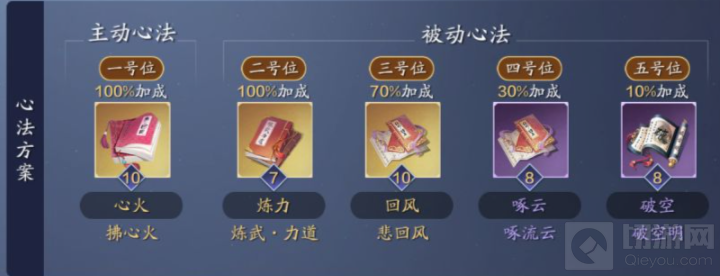 PVE玩法的心法属性配置,主要注重输出能力的培养。因此在心法上,我们推荐:主动心法:拂心火;被动心法:炼武·力道、悲回风、啄流云、破空明。