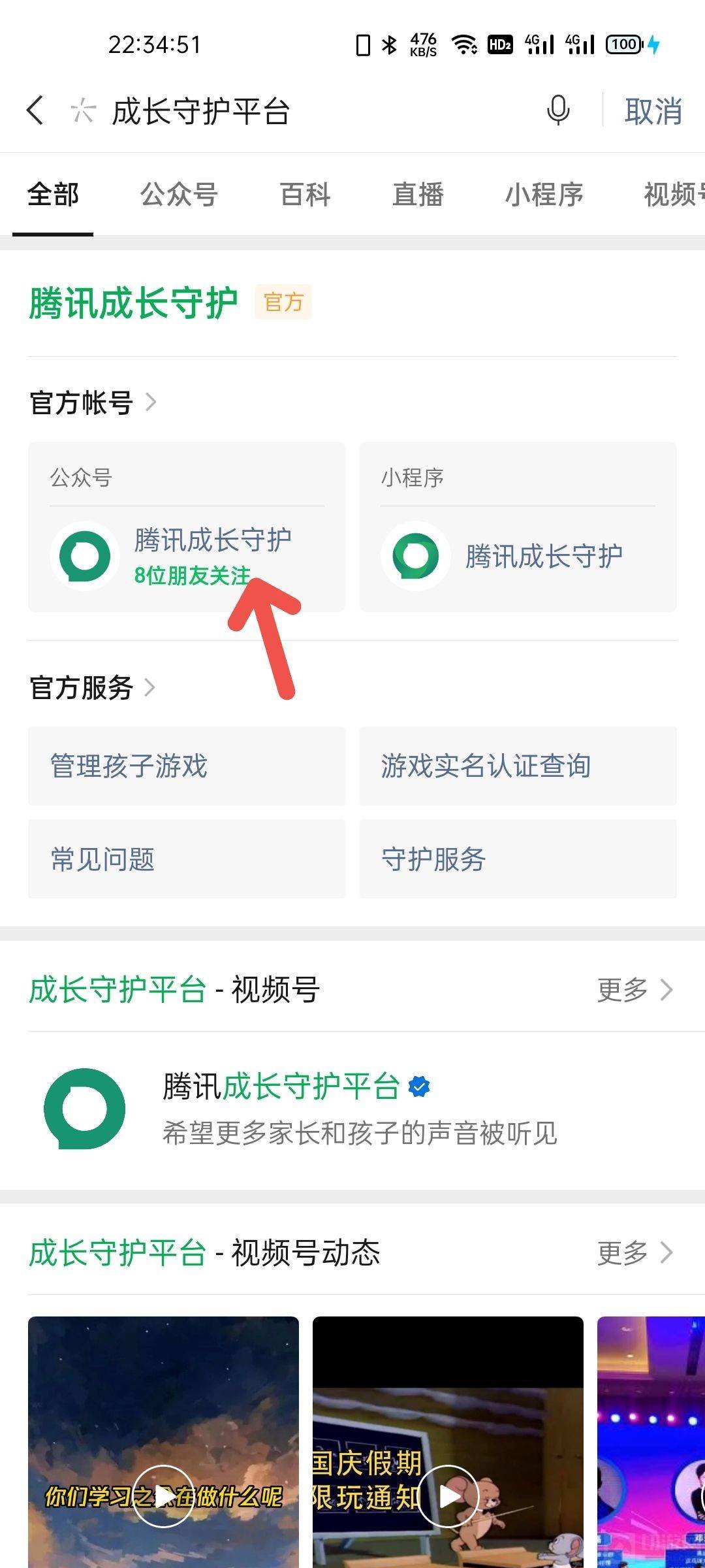 1.在微信里面搜索成长守护平台,然后点击进去公众号。