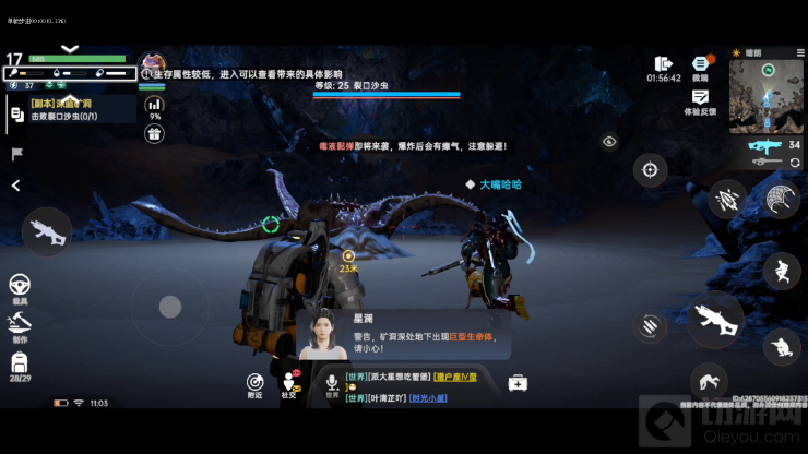 该模式最多支持4人同时挑战游玩,需要挑战的首领boss名字叫做裂口沙虫,裂口沙虫的特点就是地下恢复当受伤害裂口沙虫会躲进地下进行恢复,所以玩家们需要尽快消灭战场上的沙虫触手。