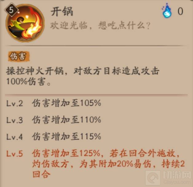 1、一技能【开锅】:对敌方目标造成伤害,满级时,若是在回合外施放,可灼伤敌方,为其施加20%的易伤,持续2回合。