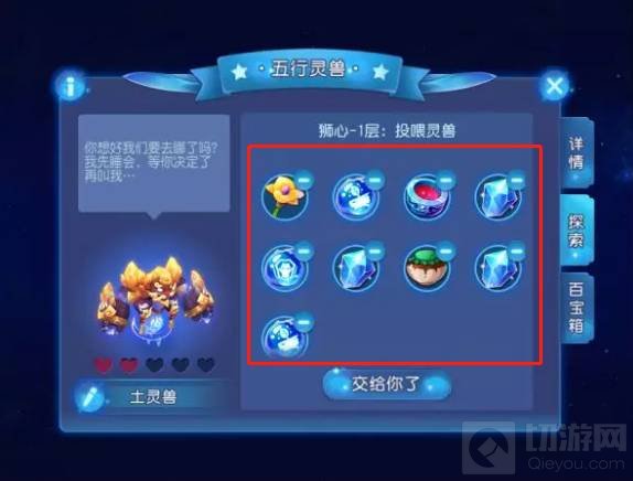 1、投喂选择:可以先用绿色晶石堆满灵兽的五星好感度,然后在一层投喂1花3内丹3蓝色晶石1臭豆腐1定神。