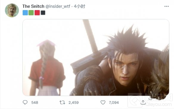 推特爆料用户“The Snitch”发布了一张《最终幻想7:重制版》结局时扎克斯出现的镜头,没有文字配文,仅是一些彩色的色块,不过蓝色、绿色、红色、黑色的色块被玩家们解读成代表着PS、Xbox、Switch和Epic或Steam平台的代表色。大量的玩家认为《最终幻想7核心危机》将重新在全平台发售。