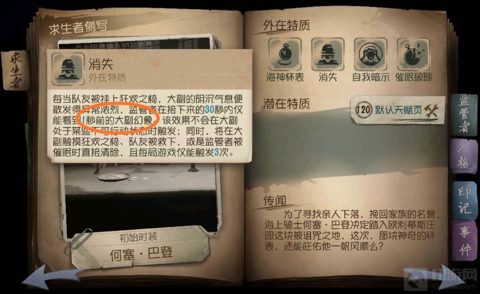 3.追击逃脱:怀表主要用到被追击的时候,用了怀表在20s的时间里监管者只能看见1s前的你,很方便逃脱。