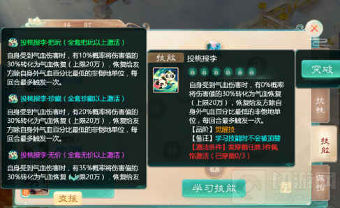 觉醒技能:投桃报李,自身受到气血伤害时,有概率将伤害值的30%转化为气血恢复(上限20万),恢复给友方除自己外气血百分比最低的非倒地单位,每回合最多触发一次;无价套装且满觉醒时,有50%概率触发。