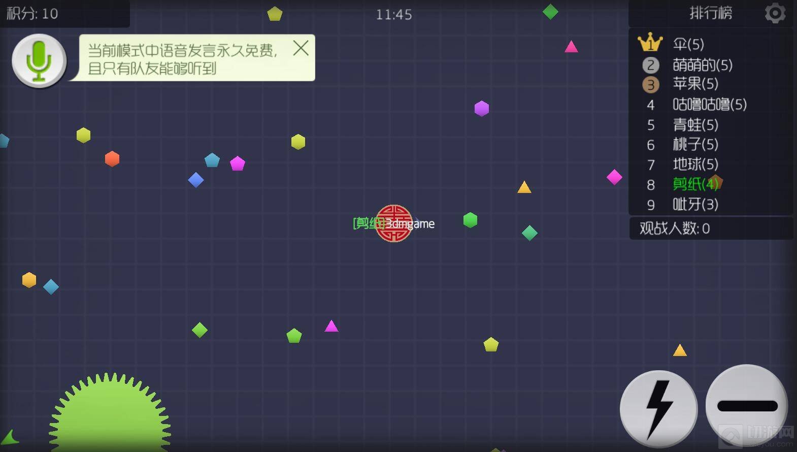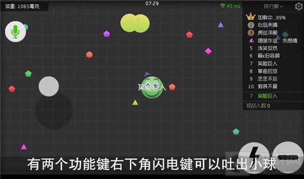 4.攻略二:逃跑技术,孢子喷射,当遇到比你大的球追击时,点击类似闪电的符号,可以射出孢子,减小体积,以加速逃跑。
