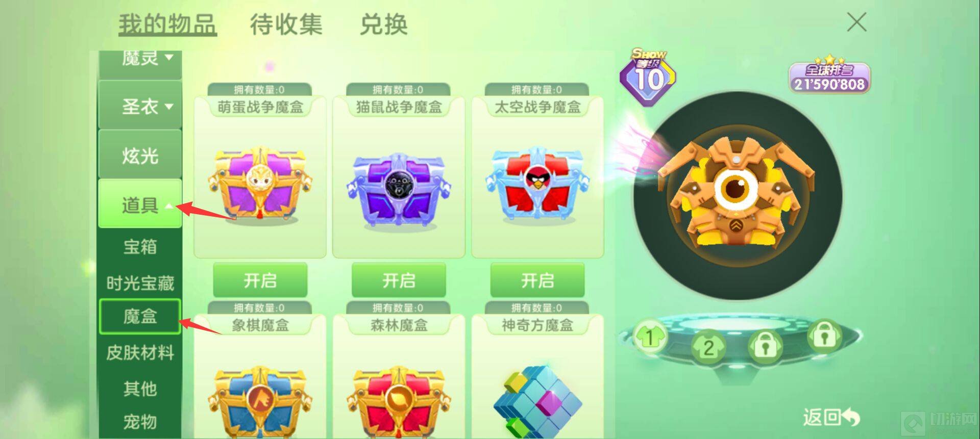 在进入到我的物品界面以后,先下滑菜单找到道具选项卡,点击魔盒,就可以开启获取的魔盒了。