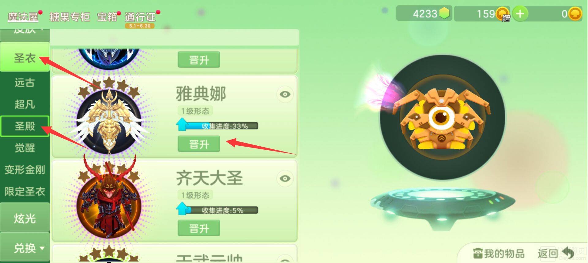 然后下滑找到圣衣,再点击圣殿,选择雅典娜,点击晋升。