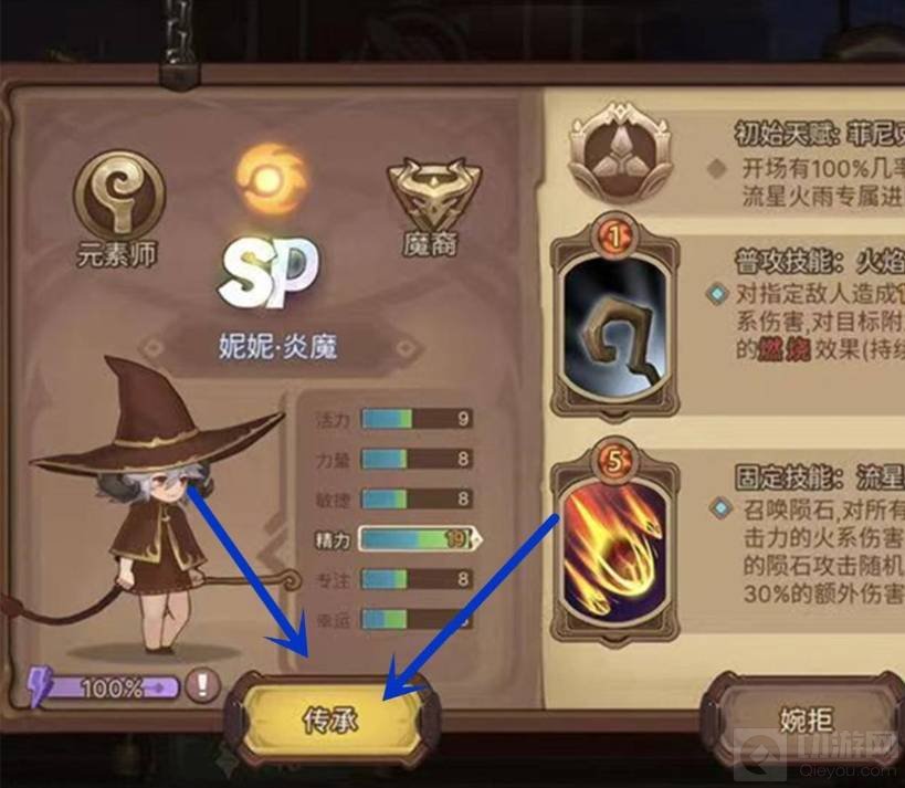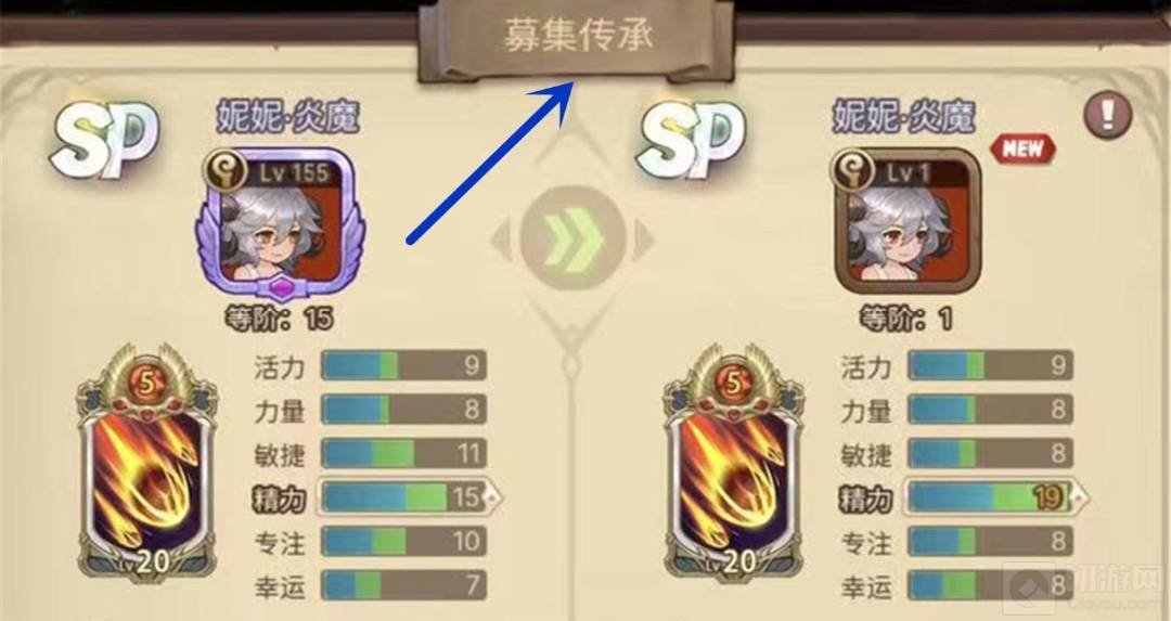 3、选择属性最高的英雄,把另一个英雄传承给属性高的英雄,这样英雄各种属性增加1点。