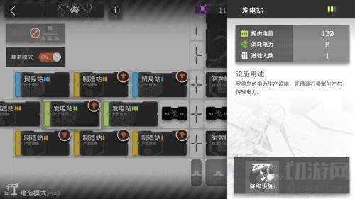 2、进入基建页面后,点击左侧的建筑图标,进入到建造模式。扳手表示可建造,砖头表示需要清理,箭头表示升级。