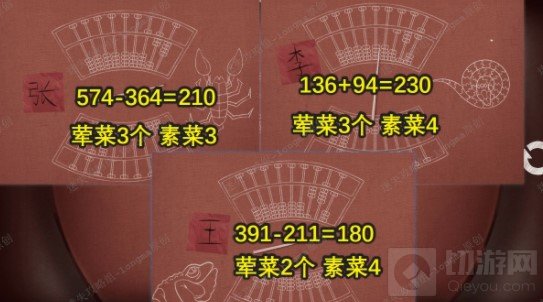 18.调查右边三个桌子,根据每一张桌子上面的算盘图案计算出每张桌子菜的价格,荤菜多少个,素菜多少个,然后将对应数量的菜放在桌子上。