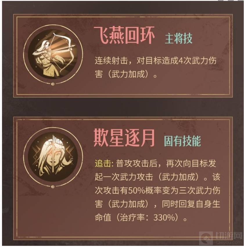 一、技能介绍:主将技【飞燕回环】连续射击,对目标造成4次武力伤害(武力加成)。固有技能【欺星逐月】追击:普通攻击后,再次向目标发起一次武力攻击(武力加成),该次攻击有50%概率变为三次武力伤害(武力加成),同时回复自身生命值(治疗率330%)。