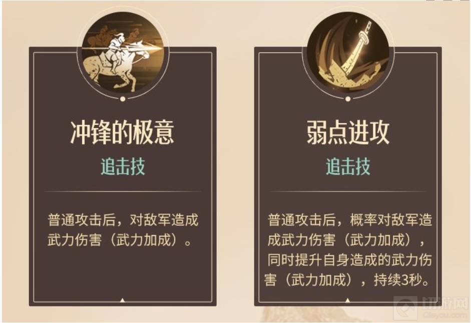 二、技能搭配推荐:【冲锋的极意】普通攻击后,对敌军造成武力伤害(武力加成)。【弱点进攻】追击:普通攻击后,概率对敌军造成武力伤害(武力加成),同时提升自身造成的武力伤害(武力加成),持续3秒。