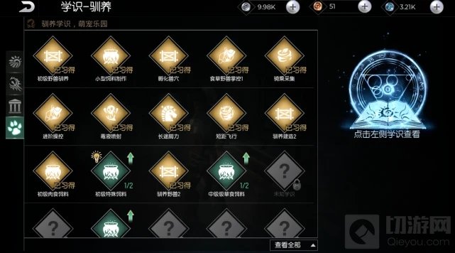 在完全解锁“初级野兽驯养”学识的三个阶段后,玩家们可以打造出三种驯兽武器,分别是捕狩猎叉、狩猎长弓、禁锢魔杖。
