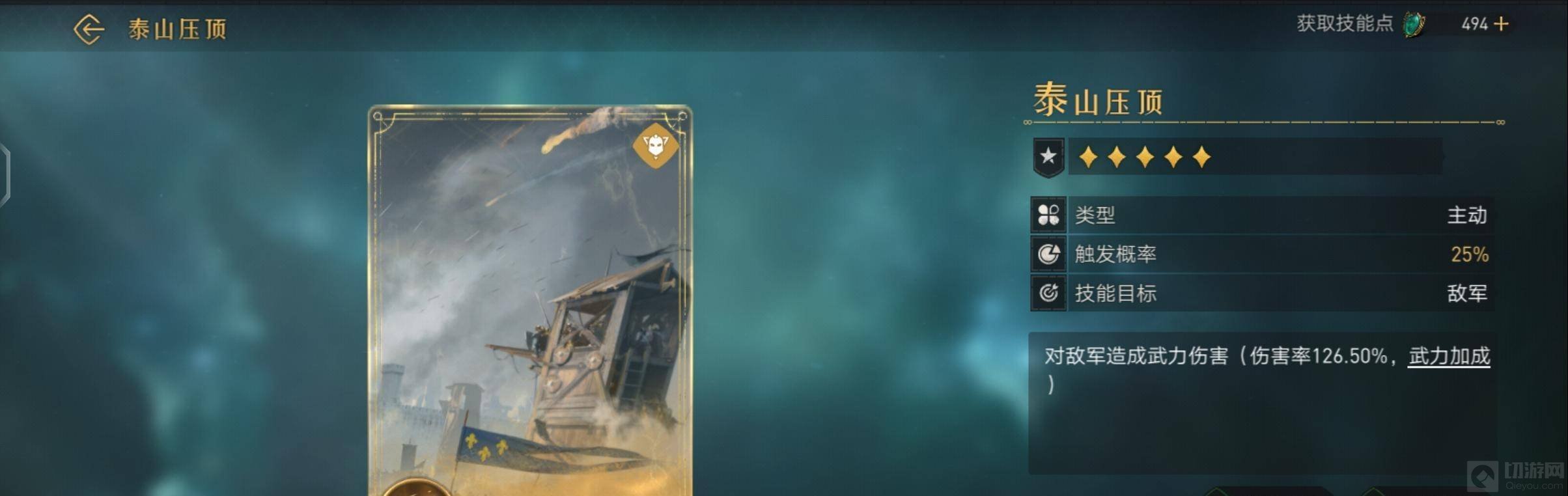 3、例如泰山压顶天赋技能作为主动释放,可以对敌军造成超高的武力伤害,特别适合女帝,乱世枭雄以及卧龙夫人这种谋士队。