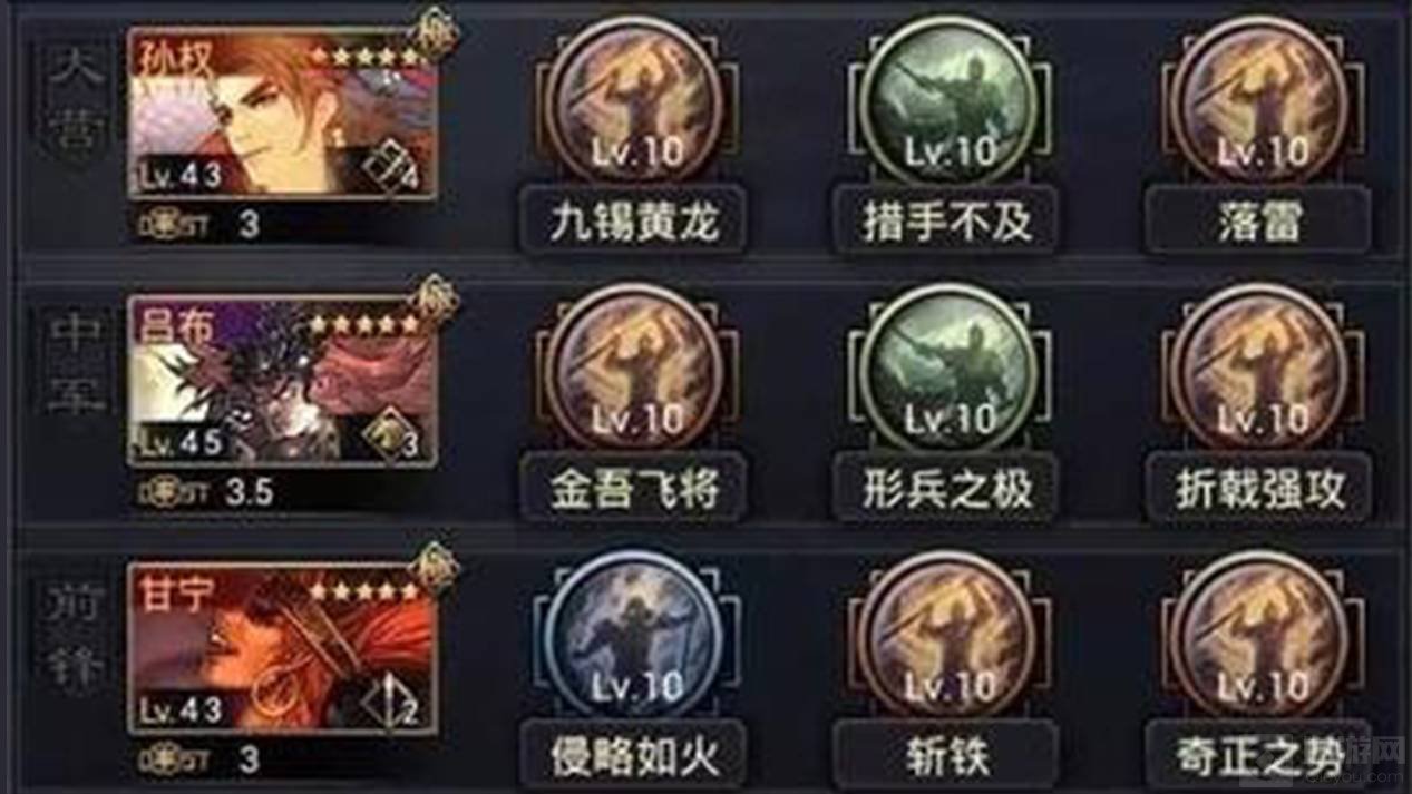 武将推荐:【大营】:孙权 【中军】:吕布 【前锋】:甘宁