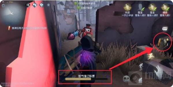 4、役鸟挡伤害会消耗格挡次数,格挡次数需要靠怒气值积攒,先知游戏界面右边的役鸟键会有一个数字,这个数字就是役鸟的格挡次数,说白了就是能挡几次伤害,挡一下就消耗一次。这个格挡次数初始为1,如果先知一直在修机没有碰到监管者,那么这个格挡次数就只有1,挡一次伤害就没了;这就要靠怒气值,先知役鸟在被屠夫追的时候会出现一个怒气值进度条,进度条满了就涨一个格挡次数,一直被追的话就可以一直涨,上限为5。