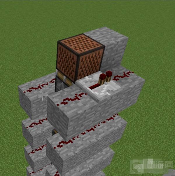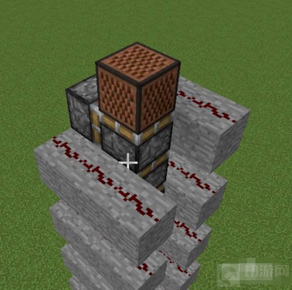 6、最顶层的活塞上方放一个不可移动方块音符盒。