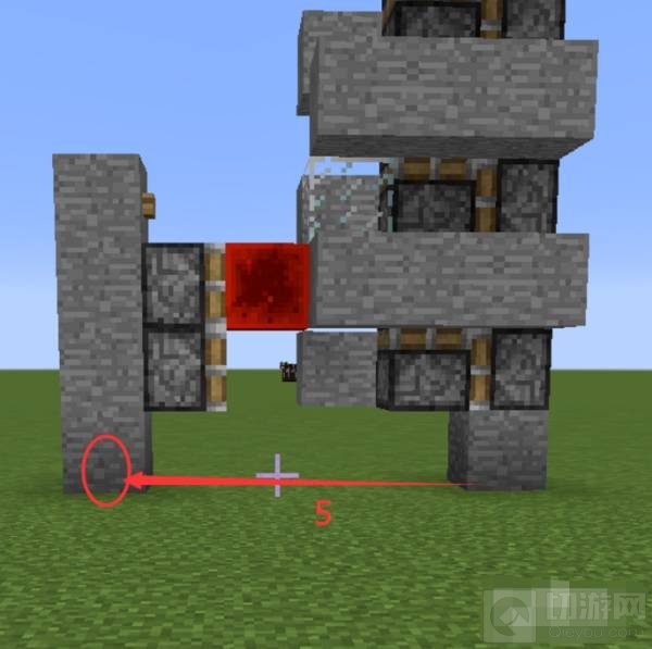 9、最底层的石头距离5格的地方放4个石头,石头中间位置放两个活塞,活塞上方放一个按钮,第二个活塞前方放一个红石块。