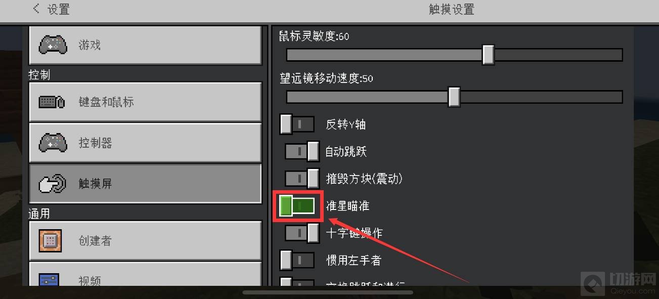 4、然后找到右侧的准星瞄准,这个就是我的世界手机版分离控制的位置了。