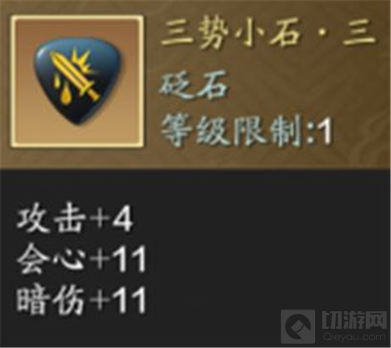 其中【气韧圆石·三】和【固海棱石·三】是必须装配的,【三势小石·三】和【催攻小石·三】属性上比较相似,考虑到三势小石获取更简单,所以我们可以优先装配三势小石,催攻小石作为下位替代。
